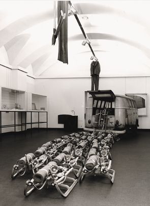 Im Innern der Neuen Galerie, im Zentrum des Gebäudes, war in dem vom Künstler selbst ausgewählten Raum eine seiner wichtigsten, überaus komplexen Installationen untergebracht, deren Exponate die bedeutendsten Stationen seines Werkprozesses widerspiegelten: die Gruppe der frühen Zeichnungen, die vier Vitrinen mit Gegenständen seiner ersten Aktionen und ebenso 12 plastische Bilder, auch diese meist mit einer seiner zahlreichen Aktionen in Zusammenhang stehend, bis hin zum zentralen Werk „The pack” (Das Rudel) entlang der Mittelachse des Raumes, seine erste Installation überhaupt. Und draußen auf dem Friedrichsplatz lagerte damals vor dem Fridericianum noch ein großer Teil der für die Pflanzaktion „7000 Eichen“ bestimmten Steine, seine erste Installation außerhalb des Museums.